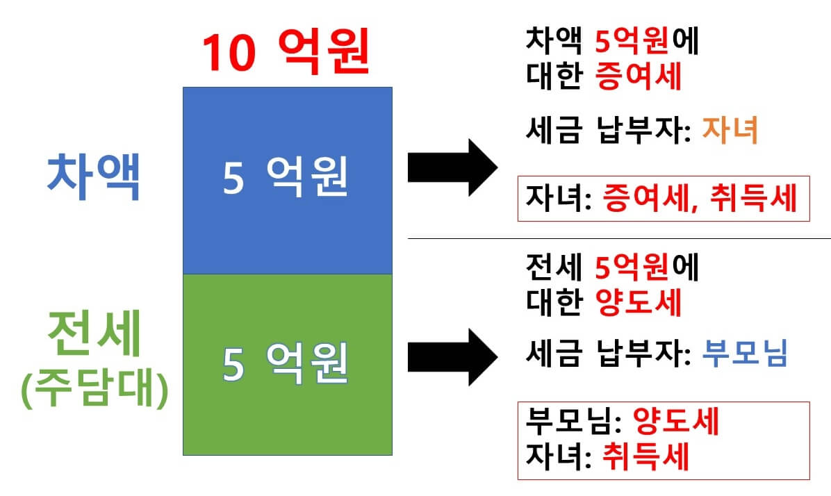 일반 증여와 달리 부담부 증여에서는 전세보증금(주담대) 5억 원을 제외한 5억 원에 대한 증여세를 내고, 주담대 혹은 전세금 같은 부채 경우는 증여세가 아니라 양도세를 내게 됩니다.