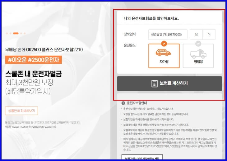이번에 저도 갈아탄 한화 손해보험의 운전자보험입니다. 2,500원이라는 정말 합리적이면서도 가장 가성비가 좋은 보험이라고 생각합니다.