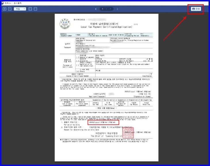 증명서 확인 해야 할 사항으로는 납세자 정보, 체납여부 그리고 증명서 유효기간을 한번 더 확인하시는 게 좋습니다.