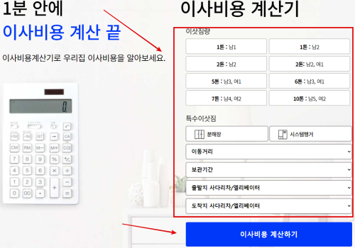 🔻 이사마스터 사이트에서 지원하는 이사비용 계산기를 활용해 먼저 예상 비용을 확인해보시길 바랍니다.