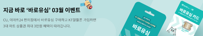 KT 망을 사용하는 알뜰폰을 개통하려면 바로유심 이벤트로 가입하시는 것이 유리합니다. 이마트 24, 롯데마트, 홈플러스 등에서 유심을 구매하고 개통하면 상품권 3만 원을 받을 수 있는 이벤트가 진행 중입니다.