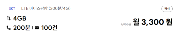 SKT 망을 사용하며, 4GB 데이터와 200분 통화, 100건 문자를 제공하는 요금제가 월 3,300원에 제공됩니다. 가성비가 뛰어난 선택입니다.