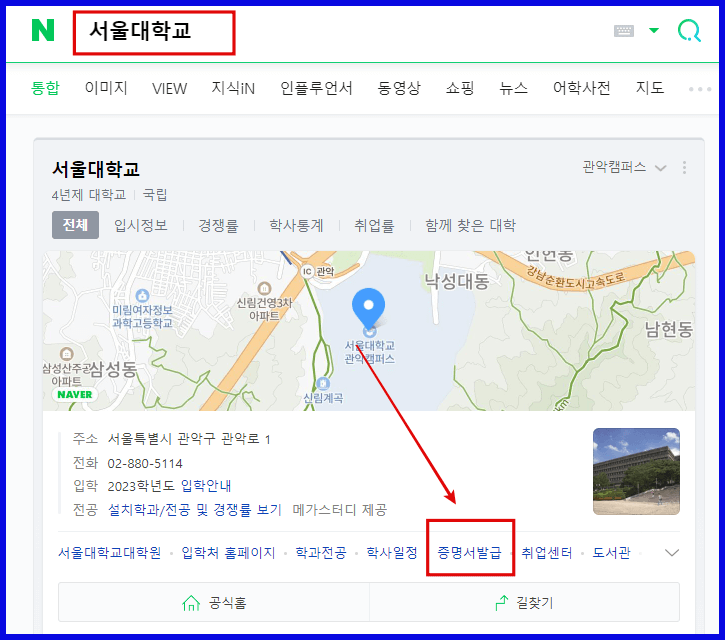 ▶ 네이버 > 해당 대학교 이름 입력 > 증명서 발급 클릭