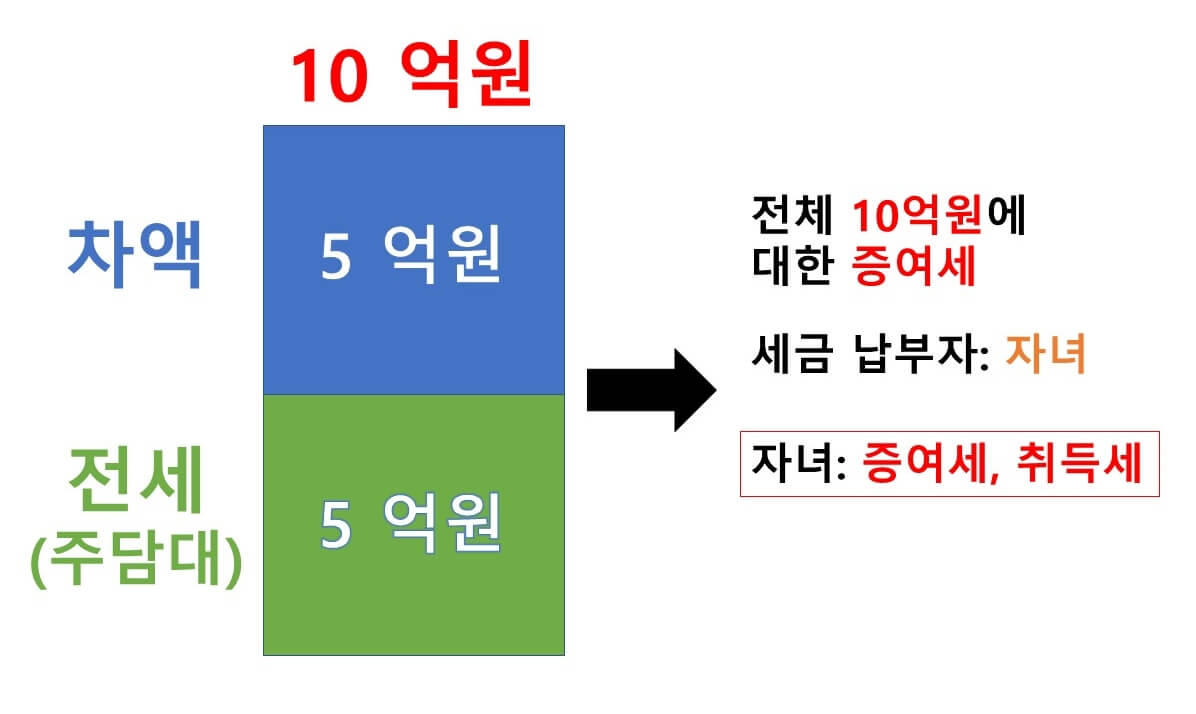 일반 증여와 달리 부담부 증여에서는 전세보증금(주담대) 5억 원을 제외한 5억 원에 대한 증여세를 내고, 주담대 혹은 전세금 같은 부채 경우는 증여세가 아니라 양도세를 내게 됩니다.
