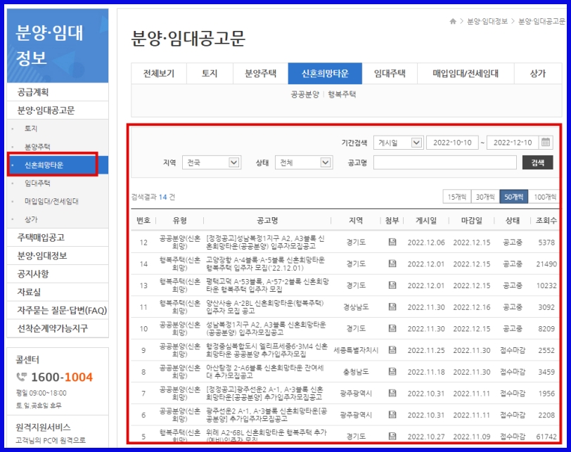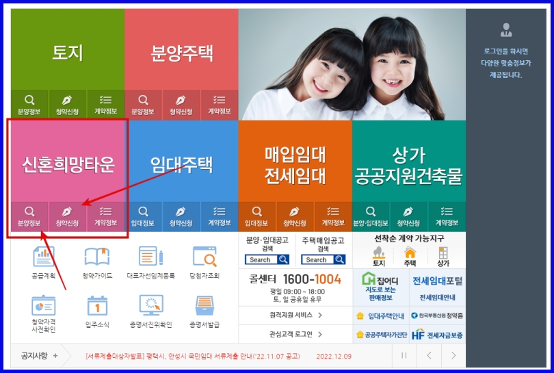 ▶ LH청약센터 메인화면 > 분양정보 > 해당하는 지역 신혼 희망타운 확인
