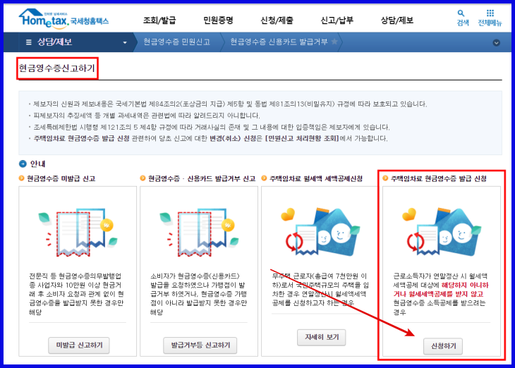 ▶ 현금영수증 신고하기 > 주택임차료 현금영수증 발급 신청 클릭
